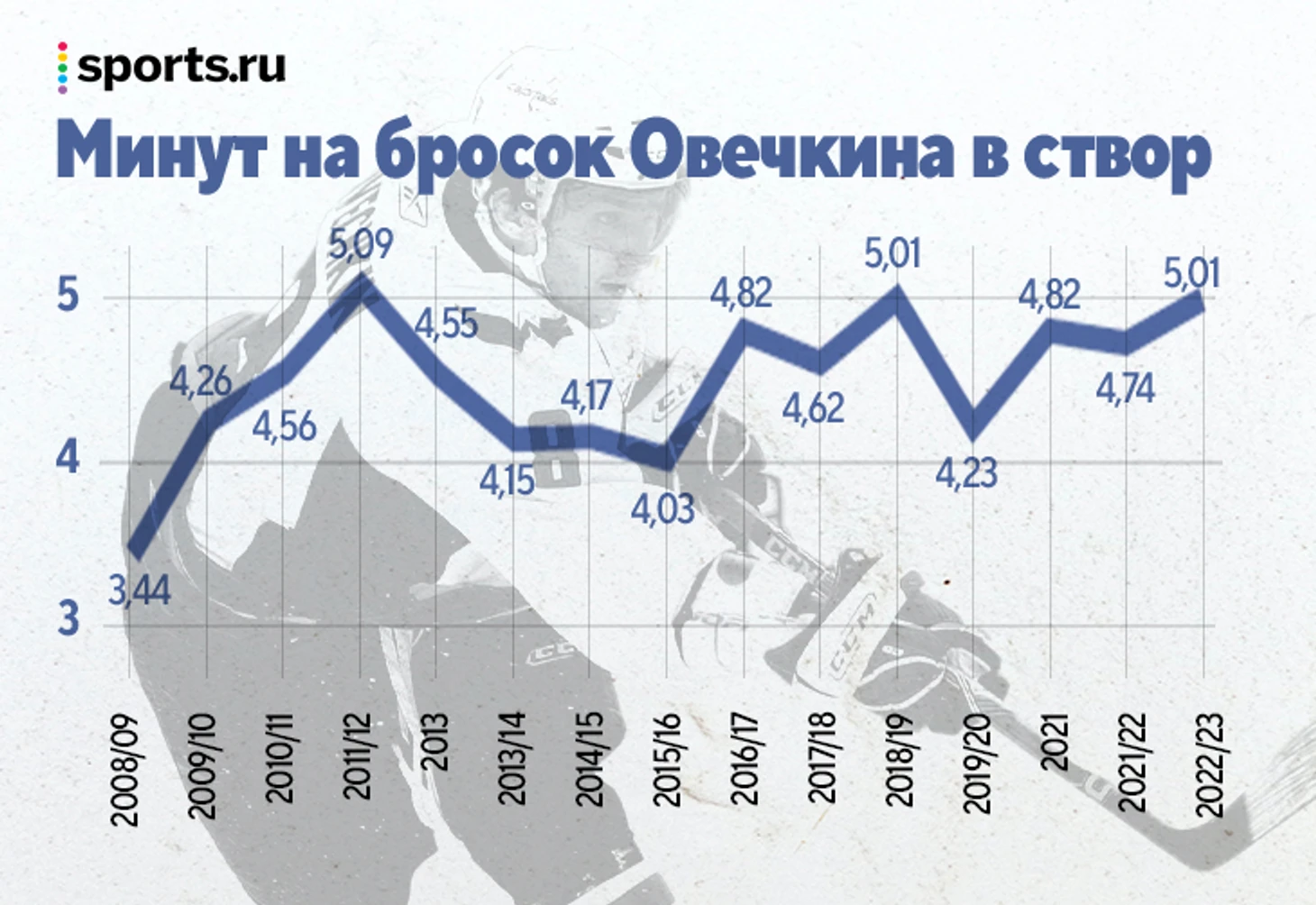 Первый – о том, как от сезона к сезону меняется количество минут, которое требуется Овечкину для броска в створ ворот.