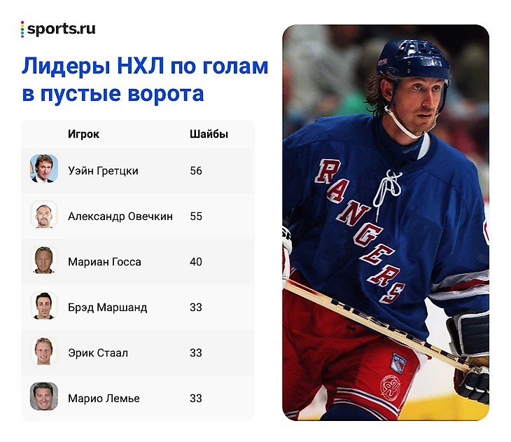 В новой игре Овечкин был не таким активным (4 броска). Шайба в матче с «Нью-Джерси» стала для него 824-й в НХЛ. До главного рекорда Гретцки остается ровно 70, но по другому показателю Александр уже почти его догнал. Овечкин забил 55-й гол в пустые ворота за карьеру в НХЛ. Всего одно такое результативное действие отделяет его от Гретцки. Остальные игроки сильно отстают.