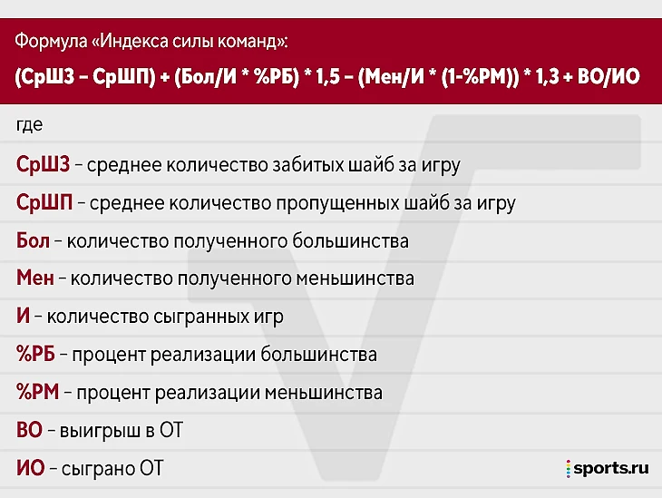 В основу положим способность команд забить больше голов, чем пропустить – для этого возьмем среднее количество заброшенных шайб за игру и вычтем из него среднее количество пропущенных.