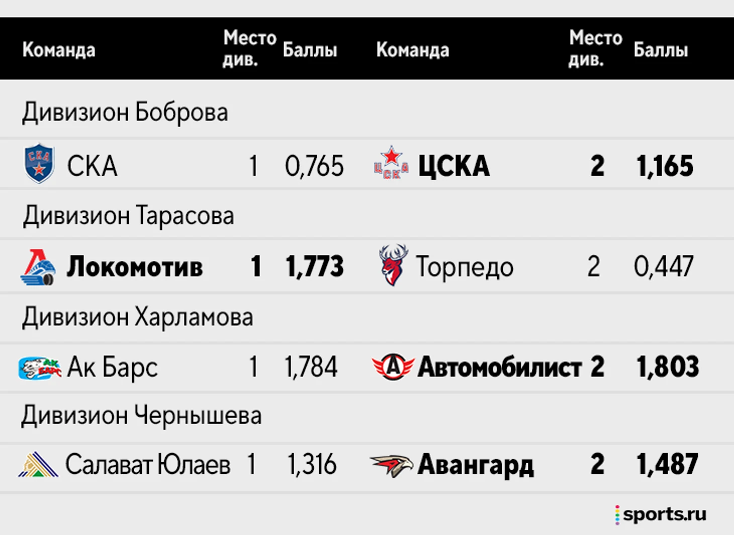 ● Дивизион Харламова: первые три места – «Ак Барс», «Автомобилист», «Металлург Мг»; четвертое и пятое – «Нефтехимик» и «Трактор»;