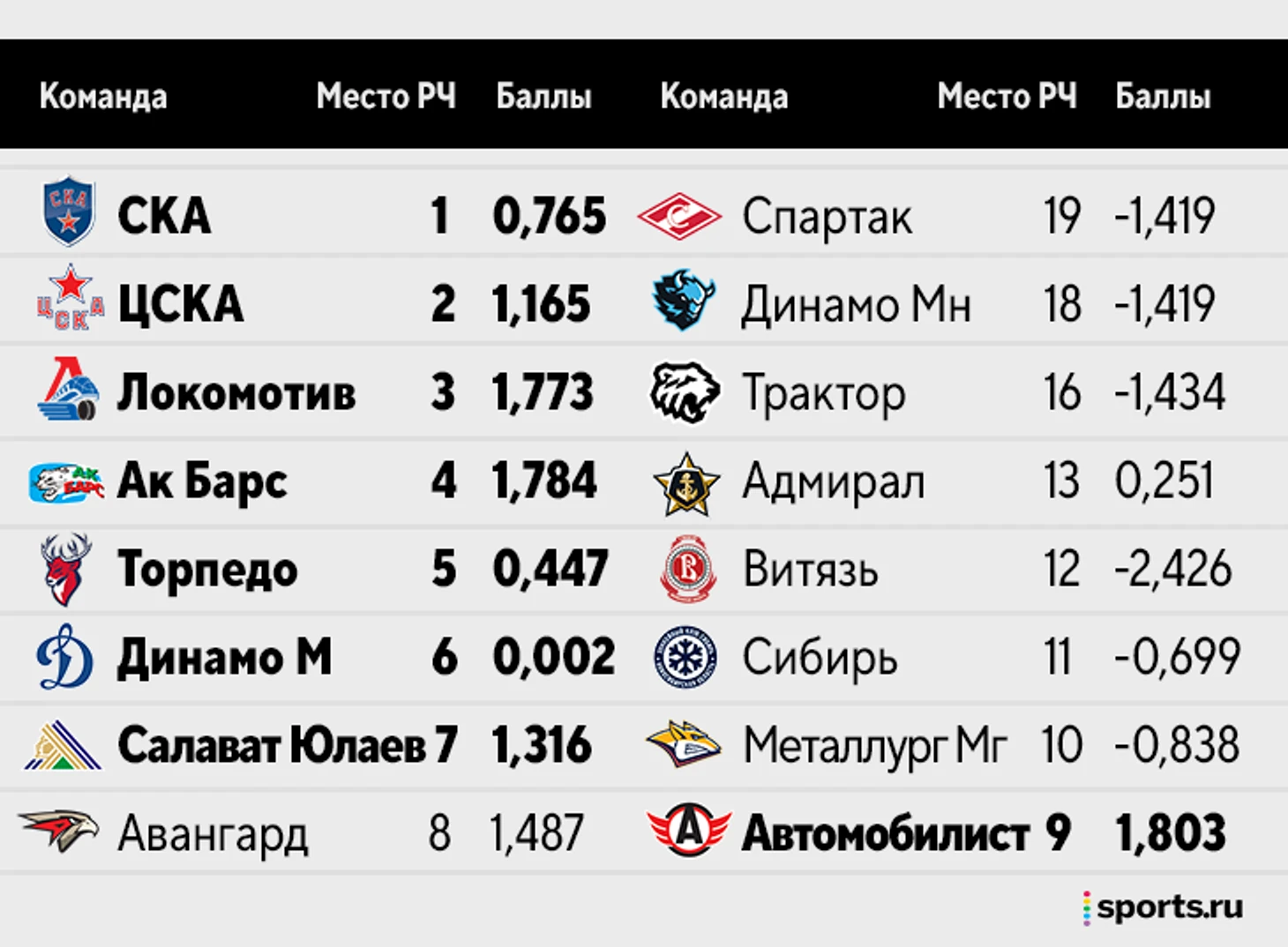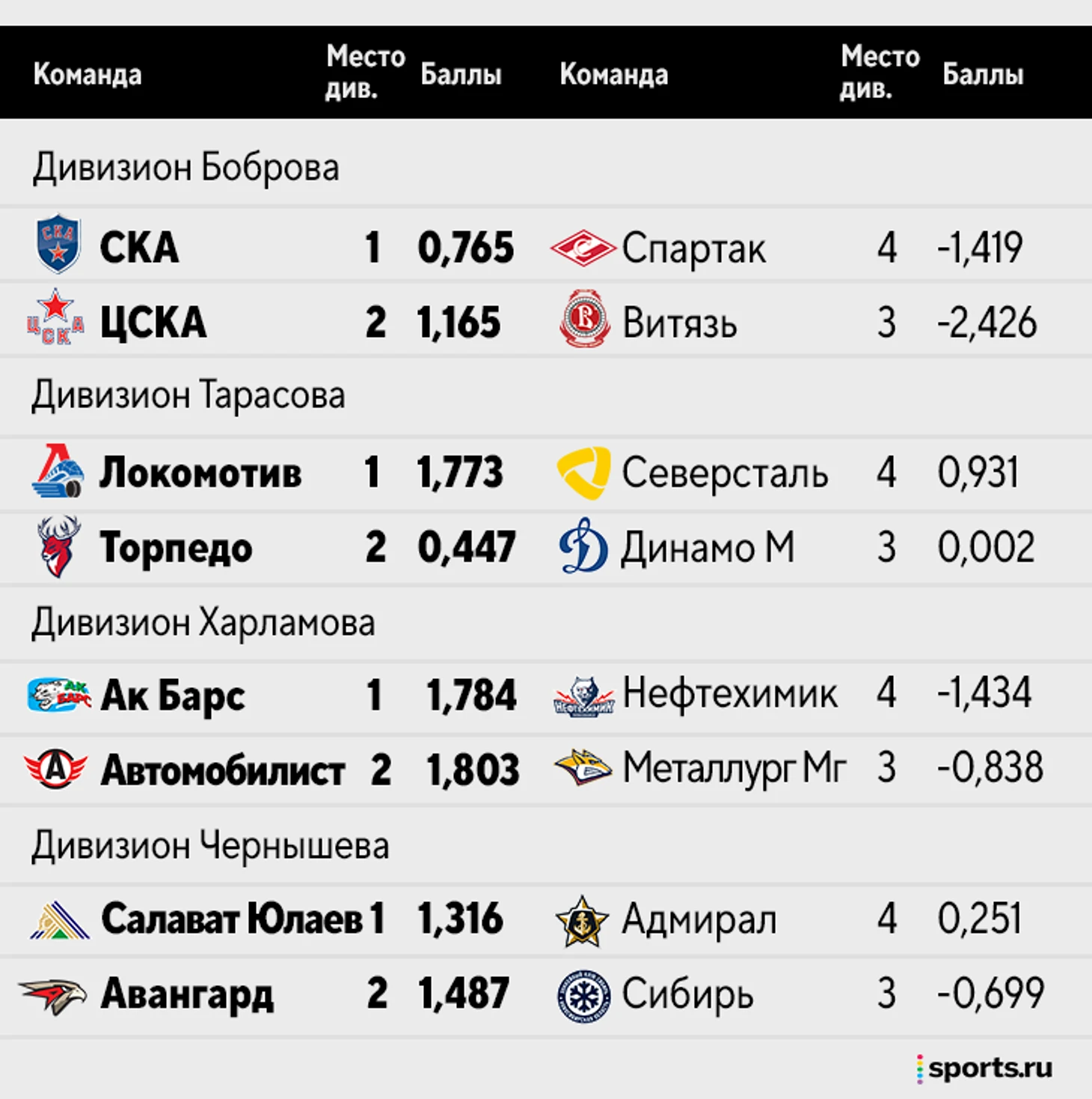 ● Дивизион Чернышева: первые три места – «Салават Юлаев», «Авангард», «Сибирь»; четвертое и пятое – «Адмирал» и «Амур».
