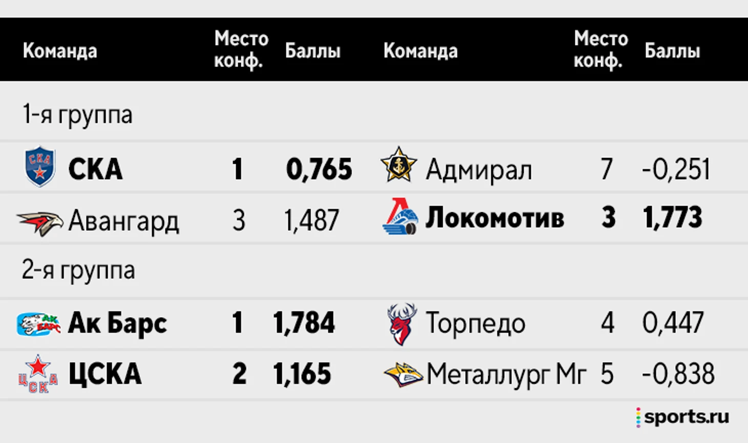 Таким образом, в первую группу по результатам 1/8 на Западе вышли: СКА (1 место в конференции по итогам регулярки), ЦСКА (2), «Локомотив» (3), «Торпедо» (4). На Востоке: «Ак Барс» (1), «Авангард» (3), «Металлург» (5), «Адмирал» (7). По новому формату мы получим следующие пары: