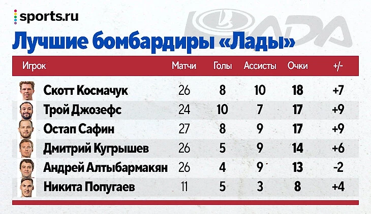 Одного взяли в оборону – и пока к словаку Миславу Росандичу есть вопросы, явно не для третьей пары защитников его приглашали. А вот с нападающими в «Ладе» угадали: канадец Скотт Космачук – лучший бомбардир (8+10), его соотечественник Трой Джозефс – лучший снайпер (10+7). Организуют голы и в равных составах, и в большинстве, но самое главное – очень вовремя: у каждого – по 3 победных шайбы. Иногда получается очень красиво.