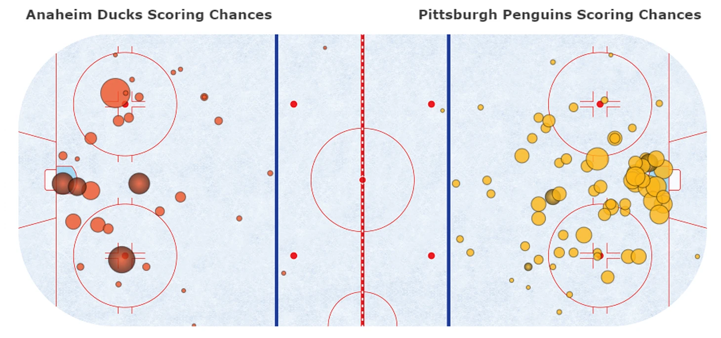 Во-первых, все решил один эпизод, который, в идеале, вообще должен был заканчиваться реализацией большинства «Пингвинс». Во-вторых, лучшая иллюстрация одной из главных проблем – карта бросков (чем больше кружок, тем опаснее бросок; круги с затемнением внутри – голы):