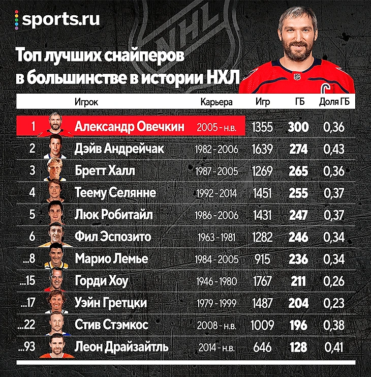 Но данные есть только с 1997 года, и в абсолютном выражении Овечкин там далеко не лидер.