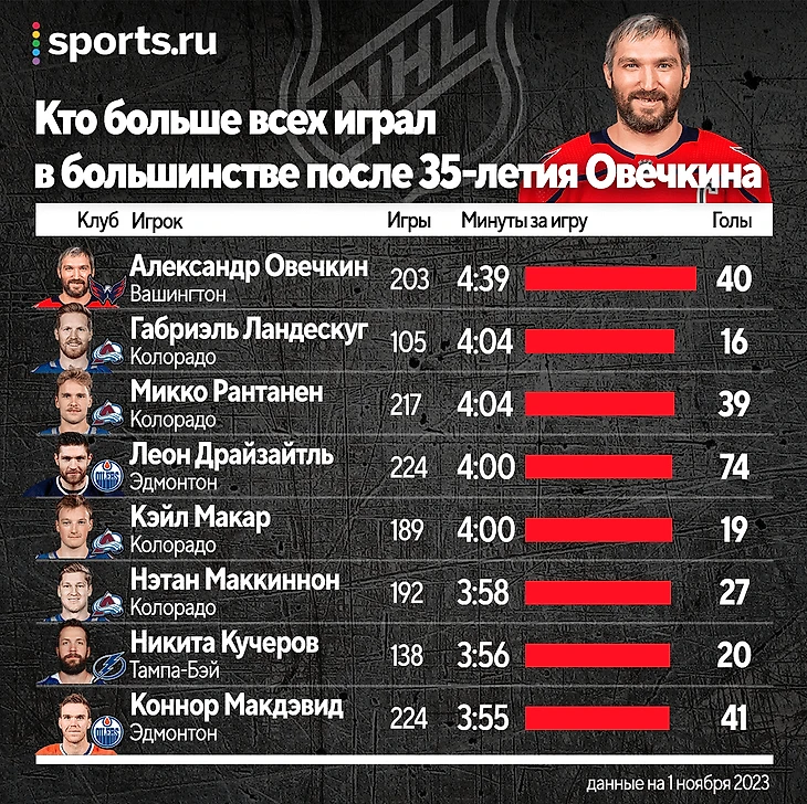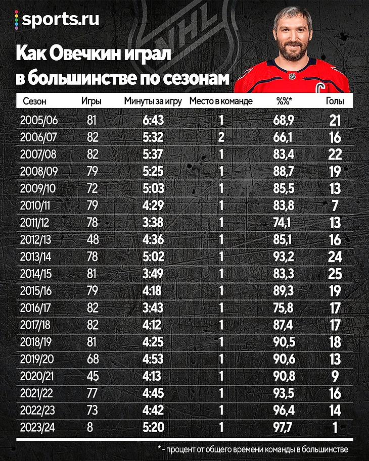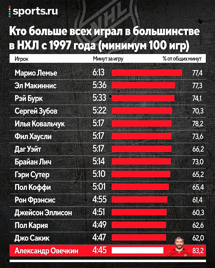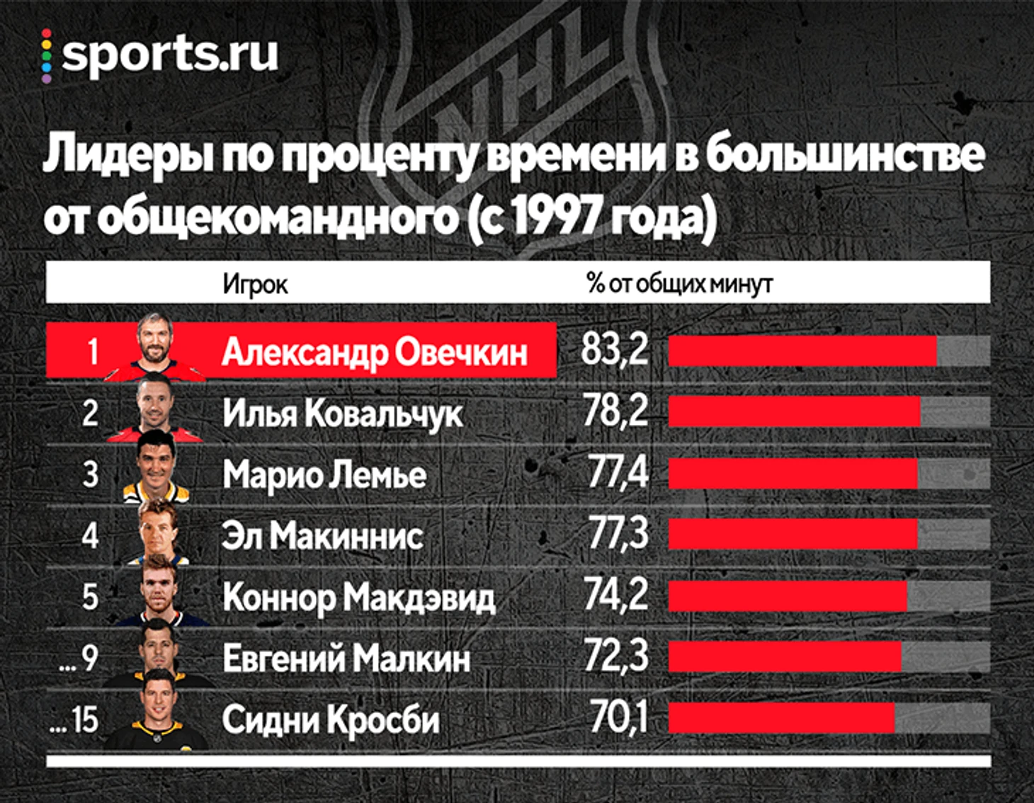 А вот в процентном отношении от времени своей команды Овечкин вне конкуренции. И Макдэвид, и немолодой уже Марио Лемье столько не играли.