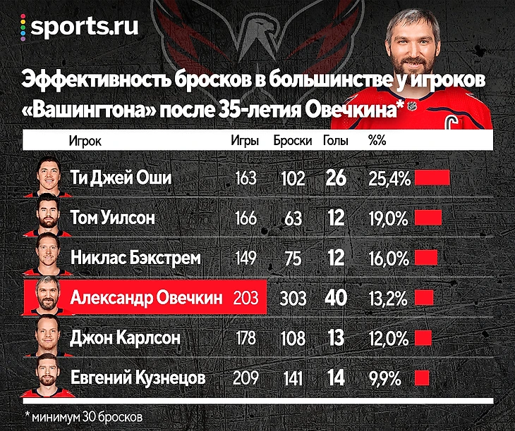 Не очень красиво выглядит табличка, да? Забивает-то Овечкин больше, но как будто «Кэпиталс» стоило бы чаще давать бросать другим.
