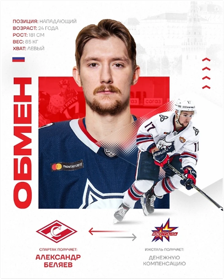 ХК «Спартак» подписал двусторонний контракт на два года с нападающим Александром Беляевым (24г, 181 см, 85 кг). В минувшем сезоне Беляев стал вторым снайпером ВХЛ и одним из лучших бомбардиров лиги, набрав 42 (24+18) очка в 49 матчах за «Ижсталь». Уже в первых предсезонных играх форвард показал как надо вгрызаться в каждый шанс в КХЛ: поквитался в кулачном бою с защитником ЦСКА Дарреном Дицем за силовой приём на Матвее Заседе, заработал на себе удаление соперника и записал на свой счет гол и передачи.