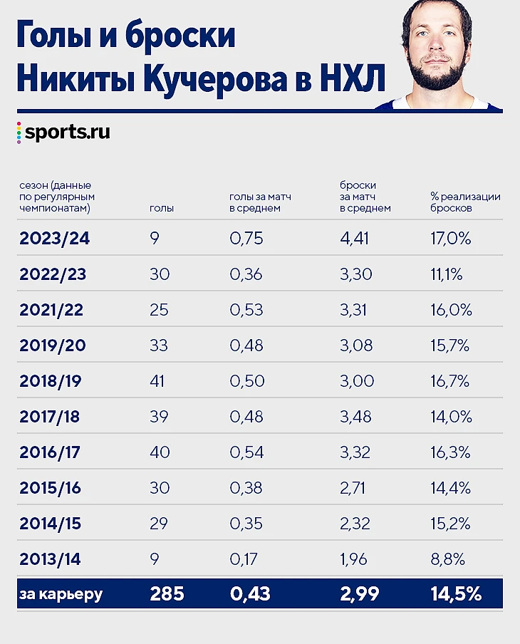 По общему количеству бросков в сезоне (53) Кучеров занимает седьмое место в лиге. Отставание от лидирующего Мэттьюса (56) микроскопическое. Никита обгоняет даже Овечкина – у Александра 43 броска (4,3 в среднем за матч) при двух играх в запасе.