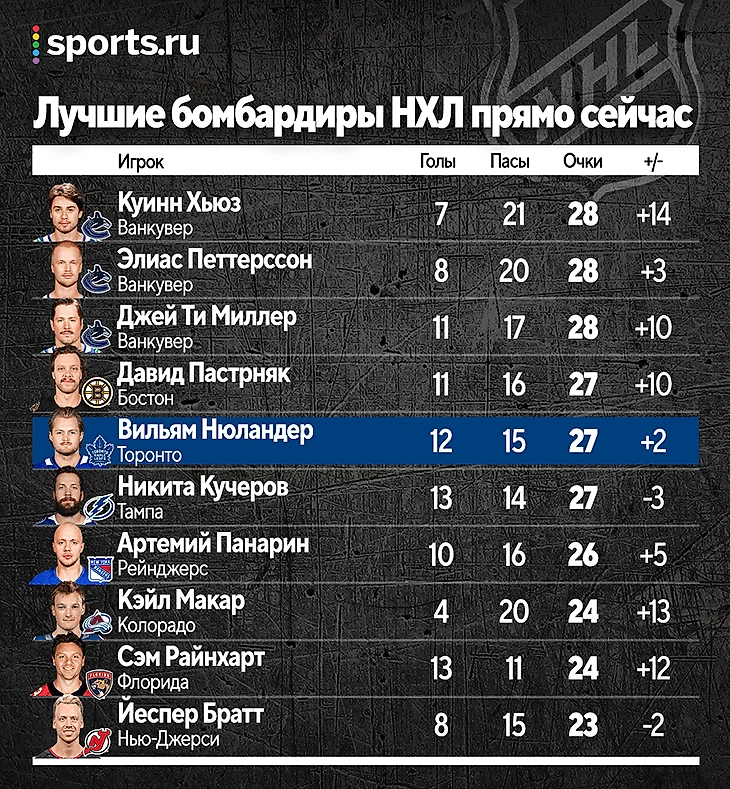 Такая поддержка помогла: теперь швед на пятом месте в списке лучших бомбардиров НХЛ, позади – Никита Кучеров и Артемий Панарин, а от лидирующего Куинна Хьюза лишь одно очко.