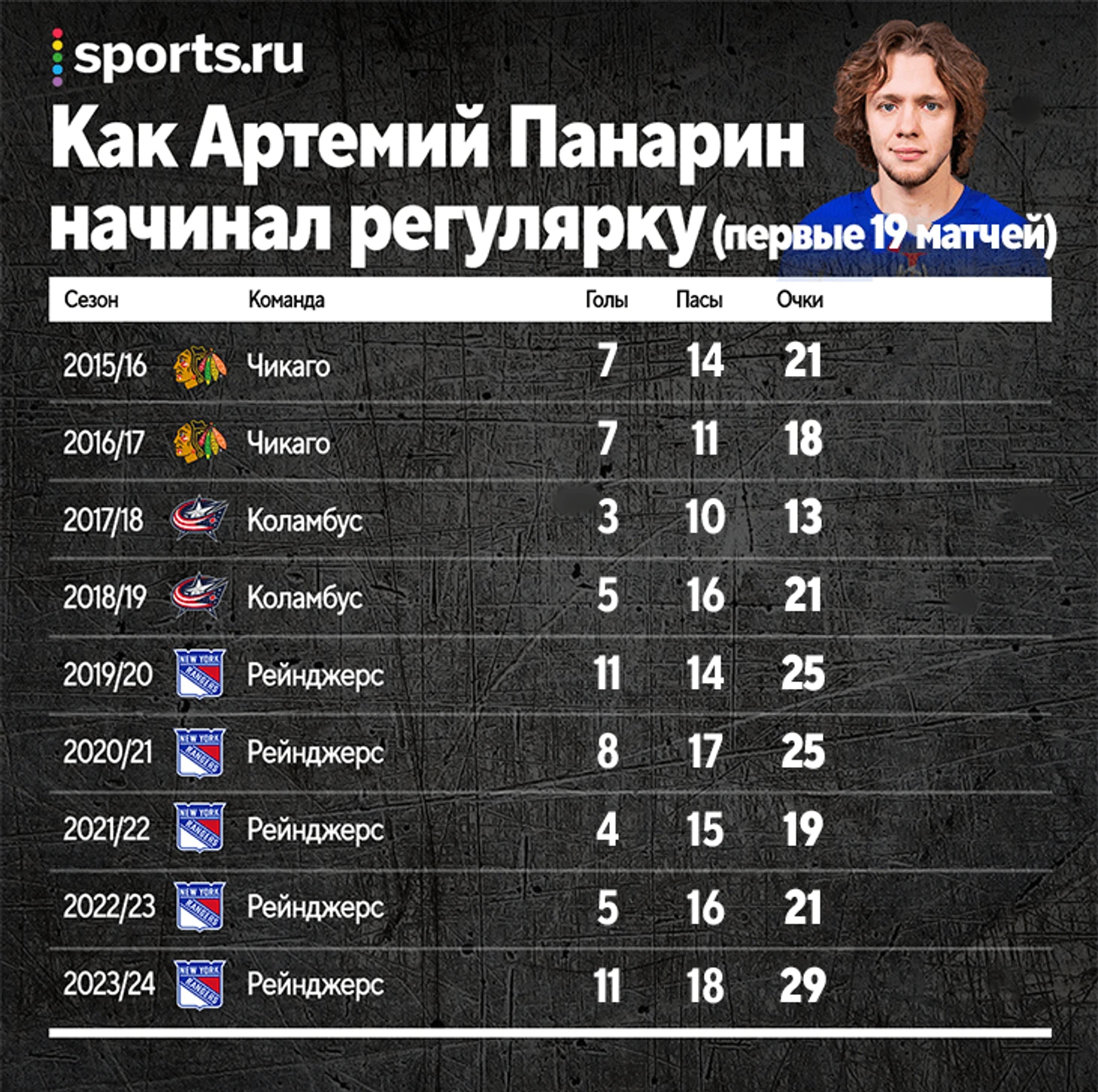 Панарин проводит девятый сезон в НХЛ, набирает больше очка за игру последние шесть лет, но ни разу не дотягивался до сотни. Пока максимальный результат Артемия – 96 (22+74) очков в сезоне-2021/22. Вот только прежде Панарин никогда не проводил этот же отрезок сезона так сильно.