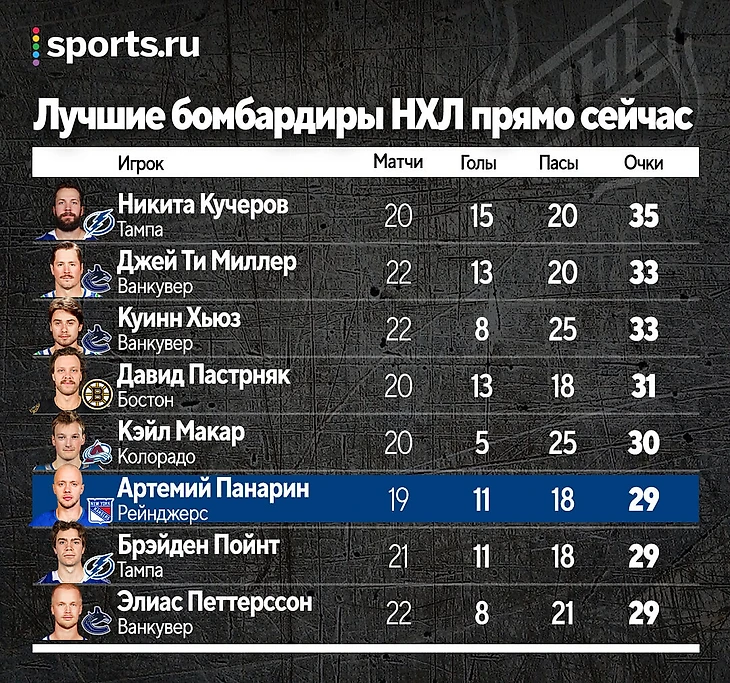По темпу набора очков Артемий вообще четвертый в лиге (1,53 за матч). Кто выше: Кучеров (1,75), Джек Хьюз (1,64) и Пастрняк (1,55).