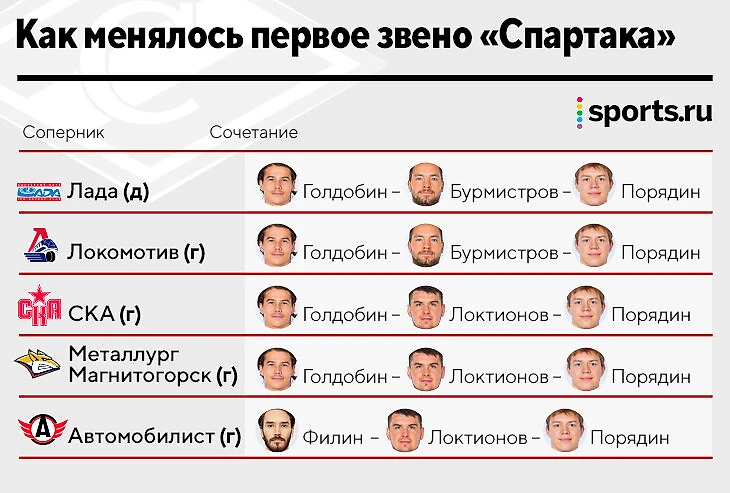 Жамнов реагирует на проблемы в игре и пробует различные варианты. В последних пяти матчах у «Спартака» выходило три разных сочетания первого звена. На игру с «Автомобилистом» Голдобин и Порядин вообще попали в разные тройки, хотя во время матча Жамнов снова их воссоединил.