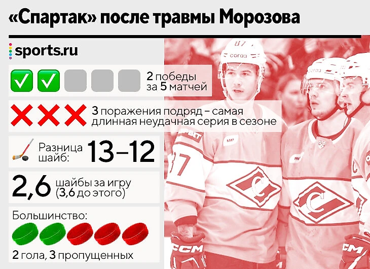 Травма ведущего центра ударила по «Спартаку» перед сложным отрезком: за домашней игрой с «Ладой» (5:3) последовал шестиматчевый выезд. Именно в нем команда проиграла три раза подряд – до этого у «Спартака» в этом сезоне таких неудачных серий не было. Победа над «Автомобилистом» остановила панику, но от проблем не избавила.
