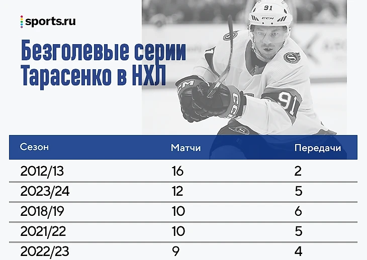 Длиннее безголевая серия у Тарасенко была только во время его первого сезона в НХЛ – тогда он не забрасывал 16 матчей. Но сравнивать молодого и не адаптированного к Америке игрока с хоккеистом, у которого контракт на 5 млн долларов, несерьезно.