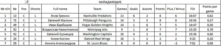 Малкин чуть сбавил темп в сравнении с собой октябрьско-ноябрьским, и его тут же нагнали Барбашев с Наместниковым, которые, похоже, вкатились в сезон. по 7 очков с солидным показателем полезности – звучит неплохо.