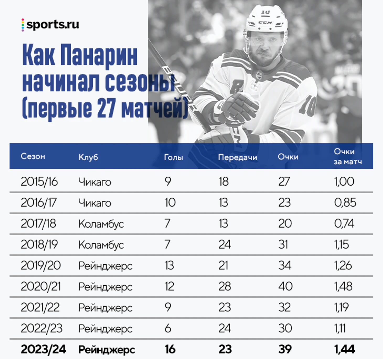 Ответственность и вина похожи на масло: их лучше размазывать, а не концентрировать на ком-то одном. У поражения «Рейнджерс» несколько виновников, но один из главных – Панарин. Его игра (0+2 в 7 матчах) – катастрофа, которую сложно оправдать. Панарин набирал 0,52 ожидаемых гола за 60 минут – никогда прежде у него не было так скудно. Для сравнения, не вполне здоровый Патрик Кэйн в новой для себя команде выбил 1+5, а xG у него просел совсем незначительно даже относительно чемпионских для «Чикаго» сезонов.