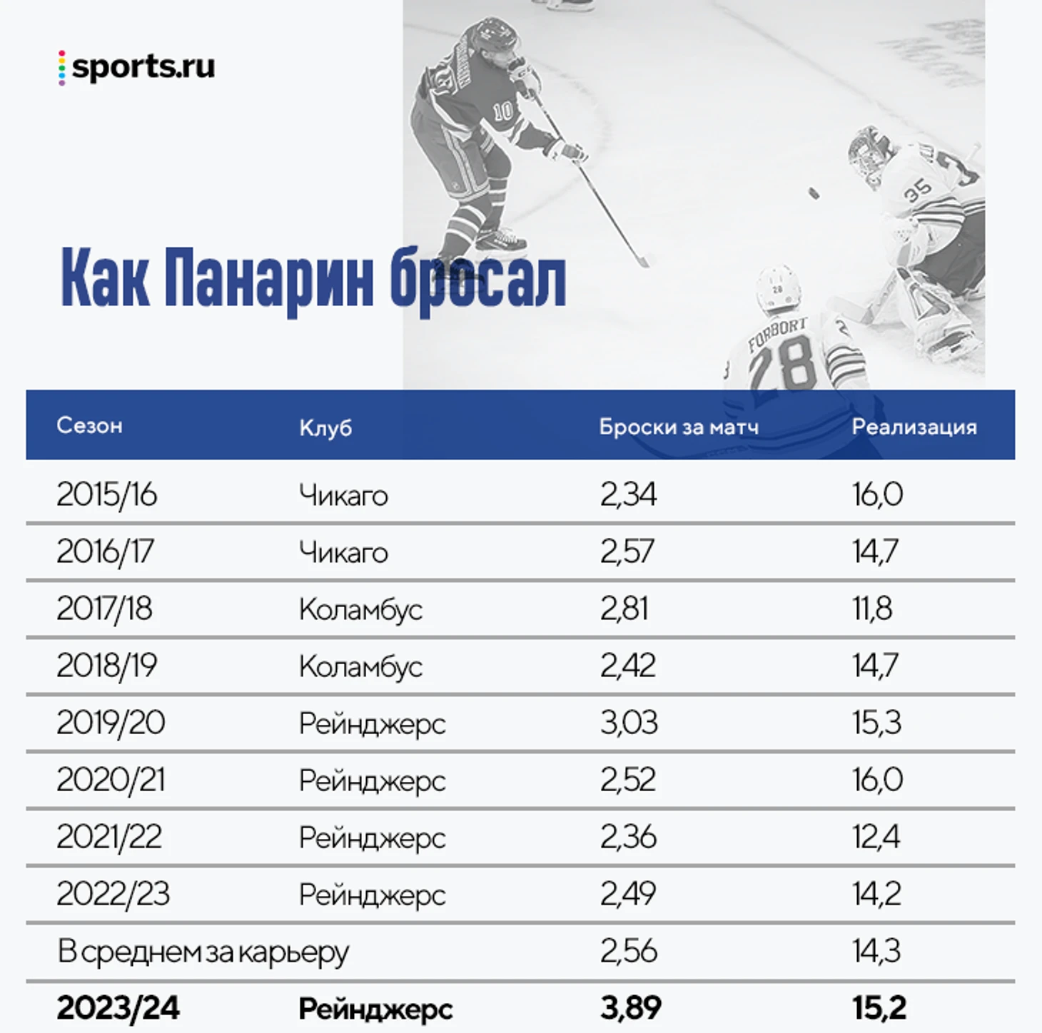 Панарин выполнил просьбу Лавиолетта: он бросает гораздо чаще, чем когда-либо. Идет двенадцатым в НХЛ по среднему и абсолютному количеству бросков. Не боится пробовать новое. В матче против «Сан-Хосе» Панарин две из трех шайб забросил в нетипичной манере – с пятака.