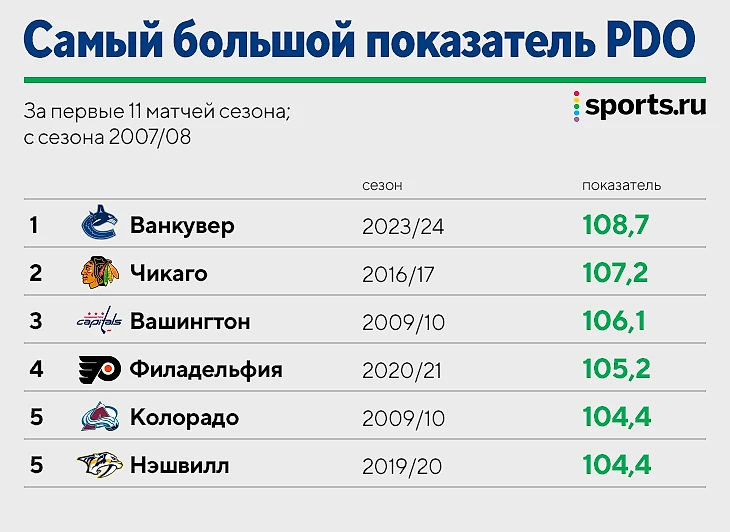 После первых 11 матчей у «Ванкувера» этот показатель равнялся 108,7 – и это было не только надежное первое место среди команд этого сезона НХЛ. PDO «Ванкувера» в первые 11 матчей сезона-23/24 был самым высоким в сравнении с первыми 11 матчами сезона всех команд с 2007-го.