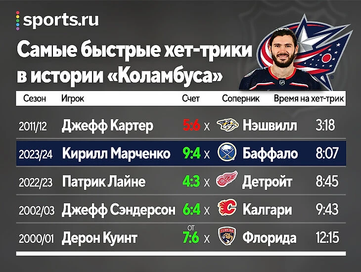 На три гола у него ушло 8 минут и 7 секунд, и это второй результат в истории «Блю Джекетс». Быстрее хет-трик оформлял только Джефф Картер в сезоне-2011/12 – он управился за 03:18. Пока этот результат не удается превзойти даже Патрику Лайне – именно ему принадлежало второе место до перформанса Марченко.