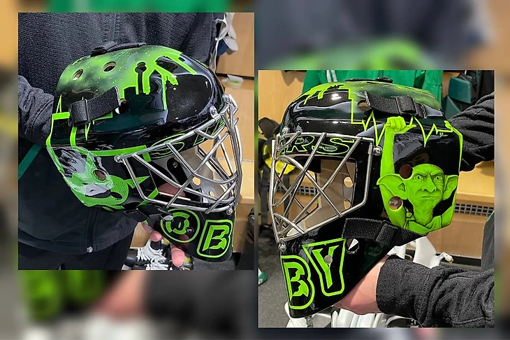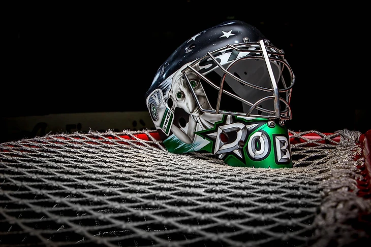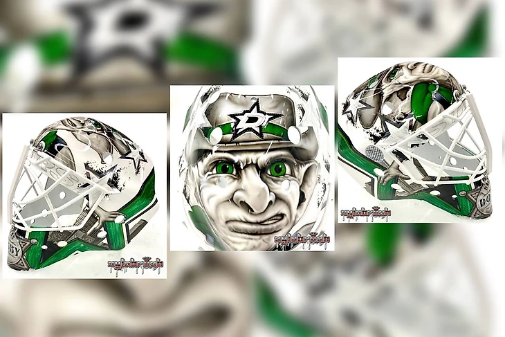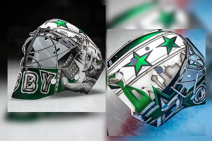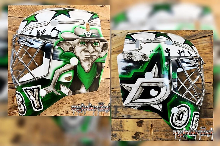 Когда «Даллас» презентовали альтернативную форму на сезон, которая представляла из себя неоново-зелёный дизайн на чёрном фоне, Антон Худобин был вынужден вновь прибегнуть к помощи Sylabrush. Обновлённый шлем был выполнен в двух цветах, таких же, как и сама форма. С левого края нас встречал грозный Добби, державший невидимую клюшку над головой, а по правой стороне тёмный силуэт штата Техас, окантованный ярко-зелёной краской. На нижней части маски буднично располагается английское прозвище вратаря, а буква «D» всё также служит логотипом команды, но теперь уже в неоновом обличии.