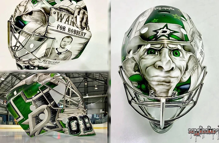 Сама идея дизайна была фантастической изначально, но Худобин решил удивить фанатов еще больше, поменяв концепцию на шлеме. По правую сторону изображен шериф Добби в цветах клуба на фоне Дикого Запада, а с обратной стороны мы видим козий череп и огромную букву «D» в виде логотипа «Далласа», но с небольшой изюминкой: центровое отверстие выполнено в стиле следа от выстрела.