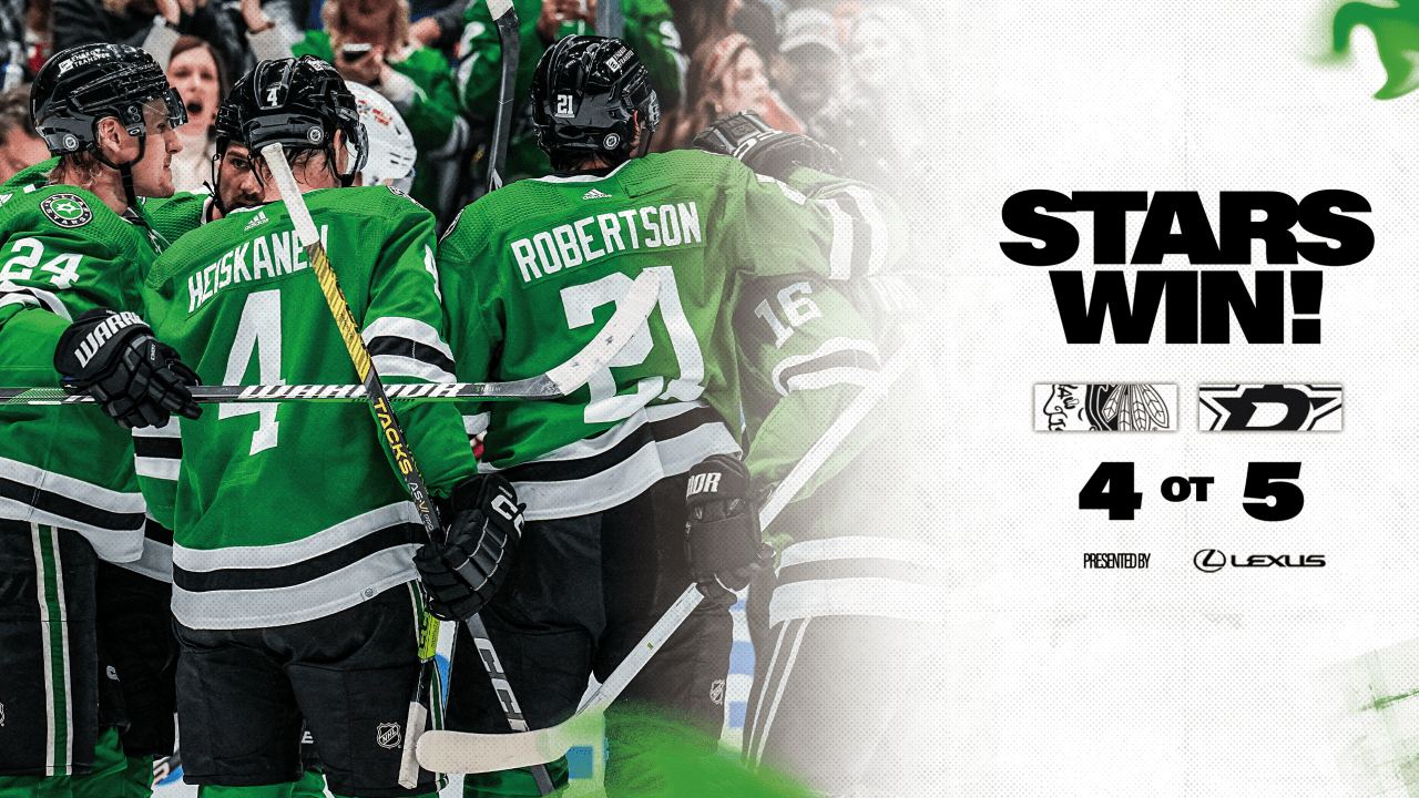 "Даллас Старз"-"Чикаго Блэк Хоукс" 5:4 (ОТ). Руп Хинтц в овертайме принёс победу хозяевам. Руп Хинтц забросил 3 шайбы, Джейми Бенн и Джо Павелски набрали по 2 очка (1+1), Джейсон Робертсон отдал 2 результативные передачи, Евгений Дадонов отдал результативную передачу, Скотт Уэджвуд отразил 25 бросков. У гостей Тайлер Джонсон забросил 2 шайбы, Джейсон Дикинсон и Коул Гуттман набрали по 2 очка (1+1).