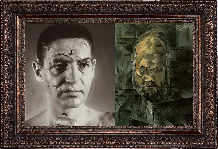 На фото, его лицо будто разбито на отдельные линии и геометрические фигуры, что отсылает нас к ранним кубистическим работам Пабло Пикассо.