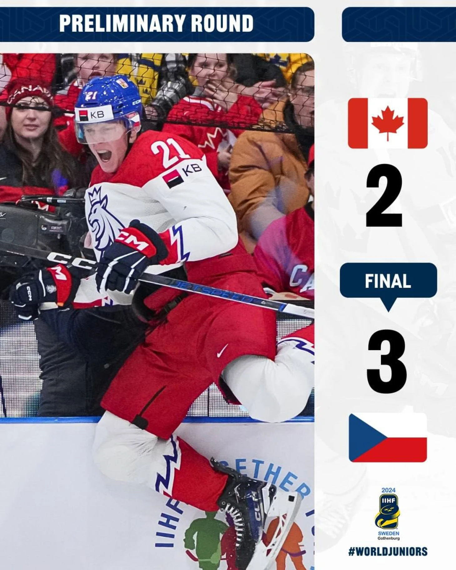 Чехия заслуживала место в списке фаворитов турнира. В том году «львы» добрались до финала, где уступили Канаде в упорной борьбе. В этом году ребята приехали тоже в полном порядке (хотя по первой игре могло сложиться другой впечатление). Костяк, тренеры, стиль игры — все осталось прежним. И было очевидно, что сегодняшняя игра не станет «легкой прогулкой» для Кленовых. Чехия красиво вернула должок за прошлый год и отправила Канаду в аэропорт. Следующая остановка для чехов - сборная Швеции в 1/2 финала (если не случится чуда).