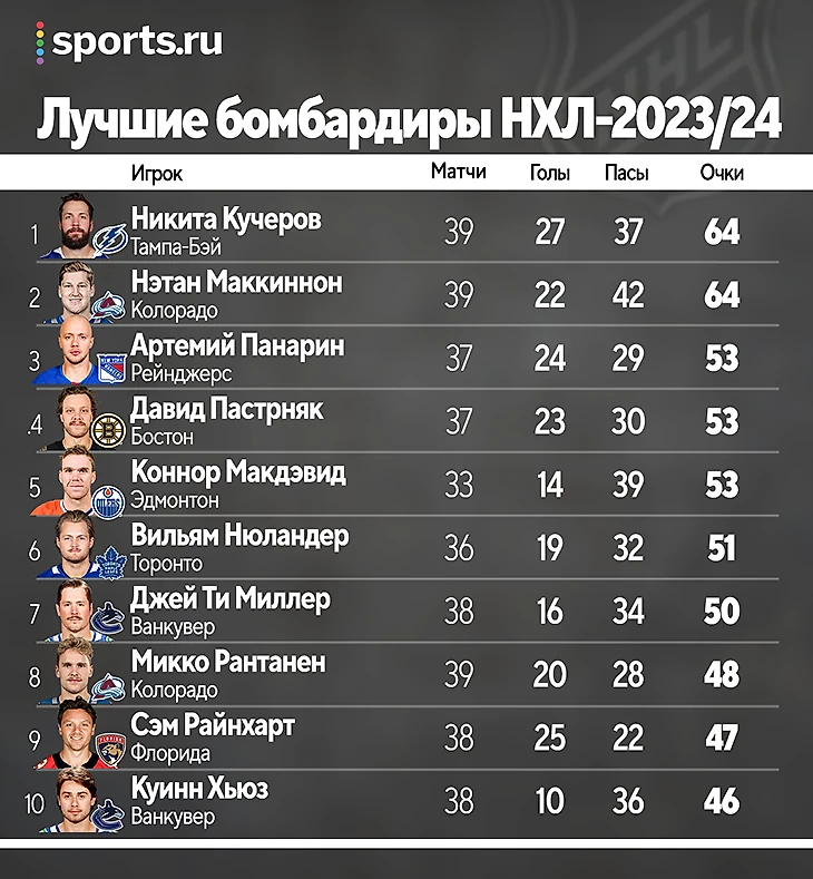 Набрав три (2+1) очка, Маккиннон не только стал третьей звездой матча, но и догнал Никиту Кучерова в списке бомбардиров – теперь у обоих по 64 очка. Борьба за «Арт Росс Трофи» будет мощной: набравший ход Макдэвид не сдастся просто так, а рядом с ним идут Панарин и Пастрняк.