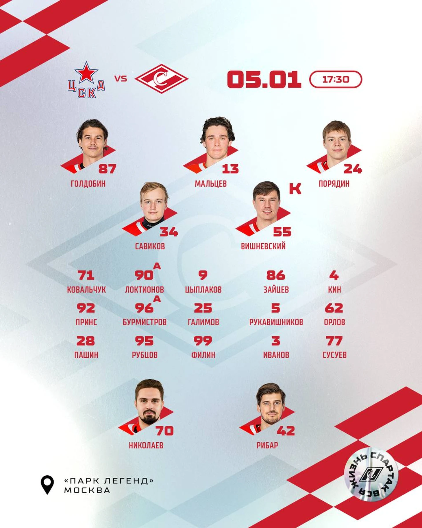 Начинаем Новый год гостевой серией со столичного дерби. По сравнению с прошлым матчем не сыграют: Ручкин, Талалуев, Беляев. Их заменили: Иванов, Ковальчук, Пашин. Ворота сегодня защищает Дмитрий Николаев. В лазарете по-прежнему остаются Михал Чайковски и Иван Морозов.