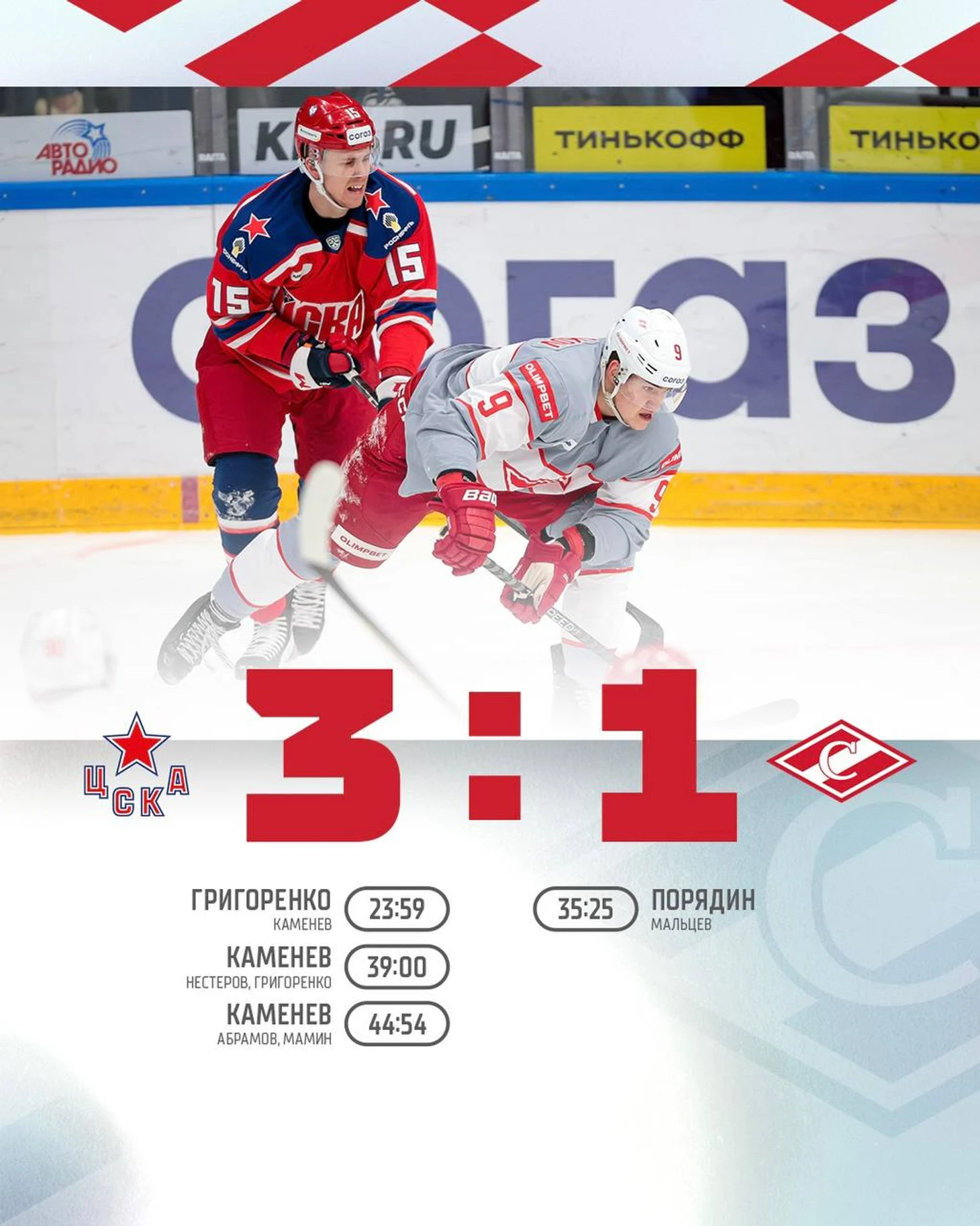 ЦСКА на своей арене победил «Спартак» в матче Фонбет чемпионата Континентальной хоккейной лиги. Счёт был открыт на 24-й минуте встречи, точным броском отметился Михаил Григоренко. «Спартак» отыгрался благодаря голу Павла Порядина, но второй период закончился в пользу армейцев, заброшенной шайбой отметился Владислав Каменев. В заключительной двадцатиминутке снова отличился Каменев, установив окончательный счёт в матче.