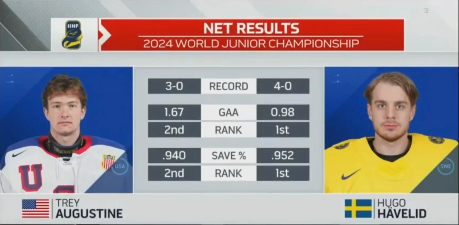По воротам обоих вратарей в итоге было нанесено по 26 бросков. Несмотря на итоговый счет шведский голкипер Уго Хавелид не провалился, но и не спасал в той мере, в которой можно было ожидать от него в Финале. Трей Огастин пропустил всего 2 шайбы и не позволил шведам полноценно поверить даже в теоретический камбэк.
