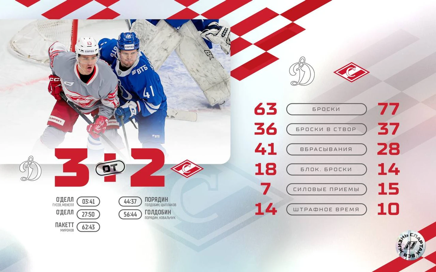 За «Динамо» дубль оформил Эрик О'Делл, забросив обе шайбы в большинстве (4-я и 28-я минуты), на что «Спартак» ответил реализацией большинства от Павла Порядина (45) и Николая Голдобина (57), однако Седрик Пакетт в овертайме принёс победу команде Алексея Кудашова (63).