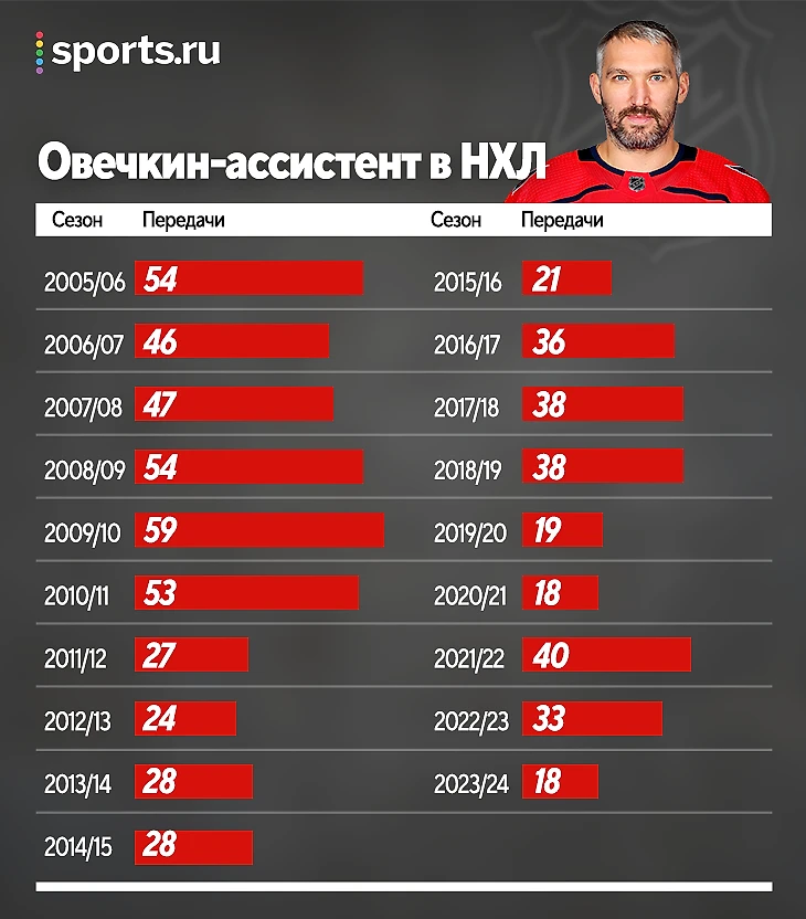 Хотя не стоит считать, что Александр переквалифицировался в ассистента – он всегда отдавал довольно много передач (просто это было не особо заметно, пока забивал пачками). И если сохранит нынешний график, то выйдет на 39 пасов в регулярке – не лучший результат даже за последние годы.
