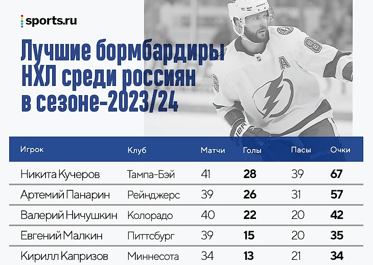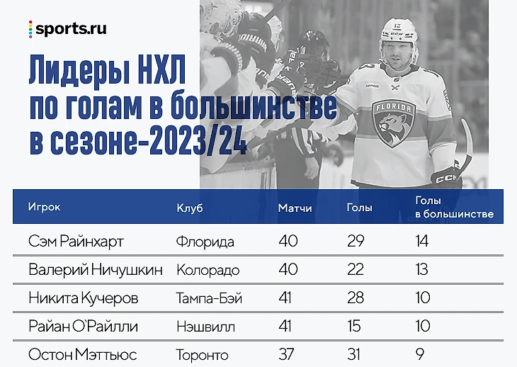 А еще у Ничушкина 13 шайб в большинстве – по этому показателю он уступает только Сэму Райнхарту из «Флориды» (14). У обоих игроков неплохой отрыв от Кучерова, идущего третьим.
