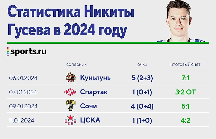 Главную роль в победах «Динамо» сыграл именно Гусев. У него 11 очков (3+8) на этом отрезке – почти 3 за игру! Особенно досталось «Куньлуню» (7:1) и «Сочи» (5:1): встречи с двумя из трех самых пропускающих команд лиги помогли Никите улучшить статистику.