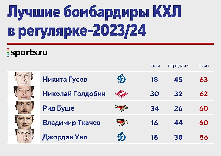 Интересно, что Ткачев, Буше, Голдобин и Уил уже переписали личные сезонные рекорды в КХЛ. Сам Гусев до собственного предела еще не добрался. В регулярке-2018/19 он уже становился лучшим бомбардиром КХЛ, когда выбивал 81 очко (17+64). Тогда Никита выступал за СКА и параллельно выигрывал ассистентский зачет.