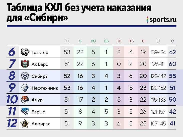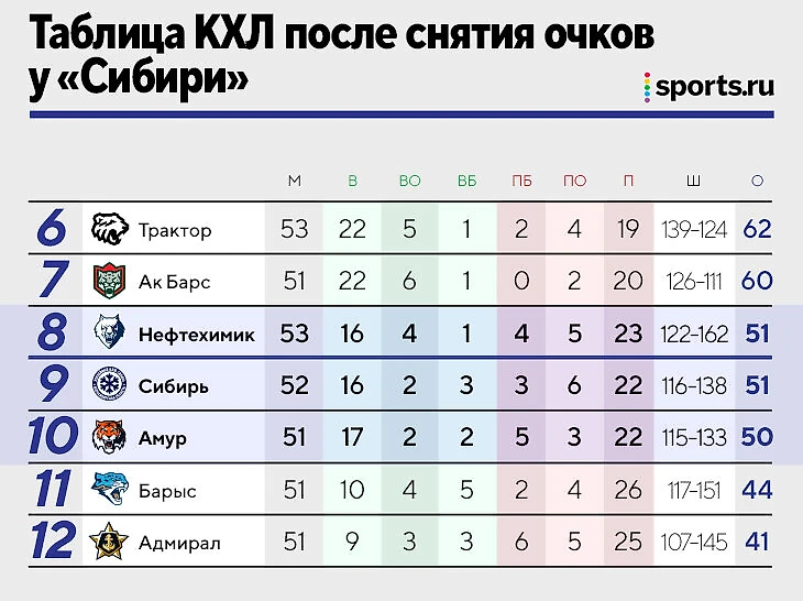 Важный итог истории – «Сибирь» теряет доминирующую позицию в борьбе за восьмое место Востока. Так дополнительные шансы получают «Нефтехимик» и «Амур».