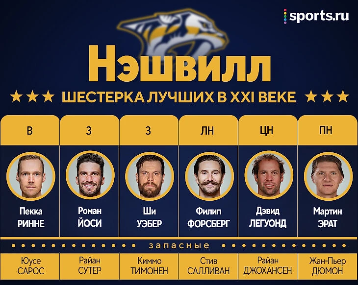 В защите – Роман Йоси и Ши Уэбер. Ко всем прочим заслугам – они еще и лучшие по играм и очкам. В запасе Тимонен – главный защитник раннего «Нэшвилла», в большинстве команд наверняка попавший бы в первую пару. И Сутер, который был бы реальным конкурентом Уэберу, если бы не укатил в «Миннесоту» в 2012-м. А ведь еще были Эллис, Экхольм, Жидлицки, Хэмьюс, Суббан, наконец.