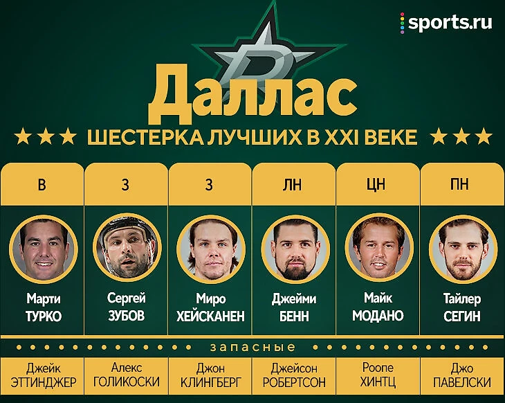 Альтернативные защитники – Клингберг, у которого были очень яркие первые сезоны (пока не подрос Хейсканен), и Голигоски, расцвет которого пришелся как раз на период в «Далласе». Нападающие – лидеры нынешнего состава. На первую тройку они, пожалуй, не успели наиграть – Хинтц и Робертсон по молодости, а Павелски поздновато пришел.