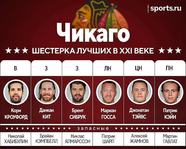 Помните команду первого сезона после локаута-2004 с ведущей тройкой нападения Колдер – Арнасон – Белл? Тогда было сложно представить, что пройдет всего четыре года – и на этом месте вырастет новая династия, которая заберет три кубка за пять лет. Соответственно, в нашей сборной вся основа, кроме вратарей – из трехкратных чемпионов. Не хватило места только Шарпу, Ялмарссону и Бикеллу. Первые двое – в запасе, а третий… скажем так, пал жертвой попытки добавить хоть немного разнообразия. Все-таки хорошие игроки в «Чикаго» были и в плохие времена. С трехкратными все понятно, а остальные тут вот почему.