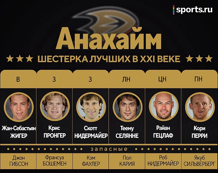 Атака «уток» вообще безальтернативна: Перри и Гецлаф – легенды на все времена, будут входить в разные символические сборные, наверное, и в XXII веке; а Селянне, покинувший команду в начале XXI, максимально ярко вернулся в нее после локаута в 35 лет и доиграл почти до 44! В запасе – волшебный Пол Кария, сыгравший ровно нужные три сезона в начале нулевых, младший Нидермайер – за большой вклад в финал-2003 и победу-2007, и Сильверберг из актуальной команды – за преданность (он уже совсем плох, но это его 11-й сезон в «Анахайме»).