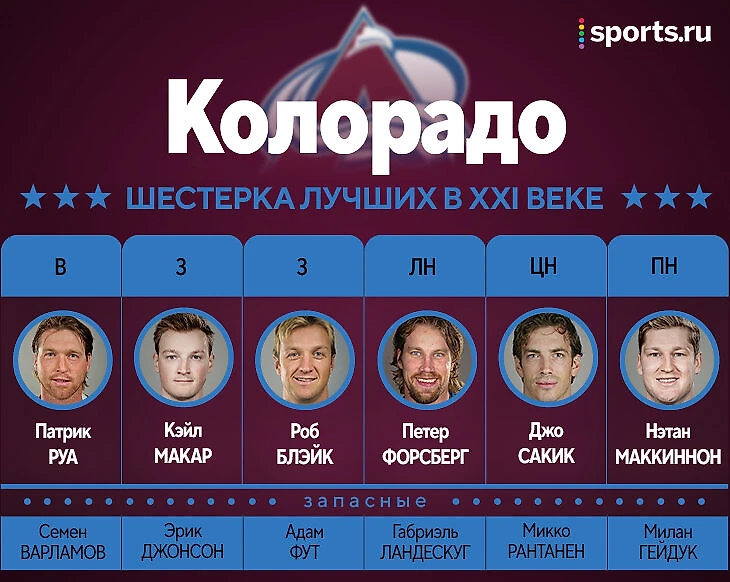 Но у команды-2001, конечно, есть преимущество: ее звезды уже заняли свое место в истории, а пятеро – вообще в Зале славы. И из этих пяти только Бурк, который тогда сразу закончил карьеру, не проходит в нашу сборную по критериям. Руа, Блэйк, Сакик и Форсберг – здесь. С ними – Маккиннон и Макар, лидеры команды сегодняшней и актуальные суперзвезды лиги.