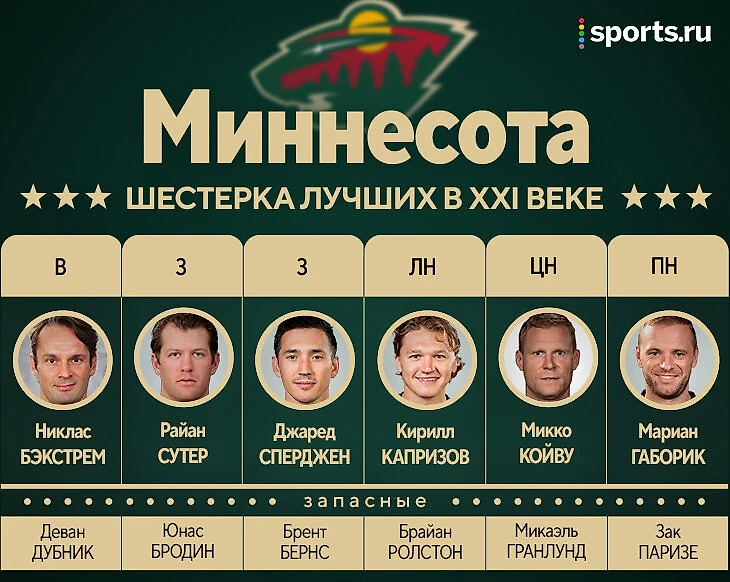 С запасными опять проблема. Кто в центре – Эрик Стаал, Гранлунд или уже Эрикссон Эк? Или вообще Дэйгл (опять шутка; кстати, вы знали, что он был лучшим бомбардиром «Миннесоты» в 2004-м? Повторил карьерный рекорд – 51 очко). У Стаала лучше пиковый сезон, но у финна в целом больше очков – и в регулярке, и в плей-офф. Фланги: Брюнетт, один из лидеров первого состава, который потом вернулся еще на три сезона? Зукарелло, Паризе, Ролстон, Поминвилл, Фиала – как тут вообще выбрать?! Каждый, по идее, достоин. Взял тех, кто чаще становился лучшим бомбардиром команды. Паризе – три раза, Ролстон – два.