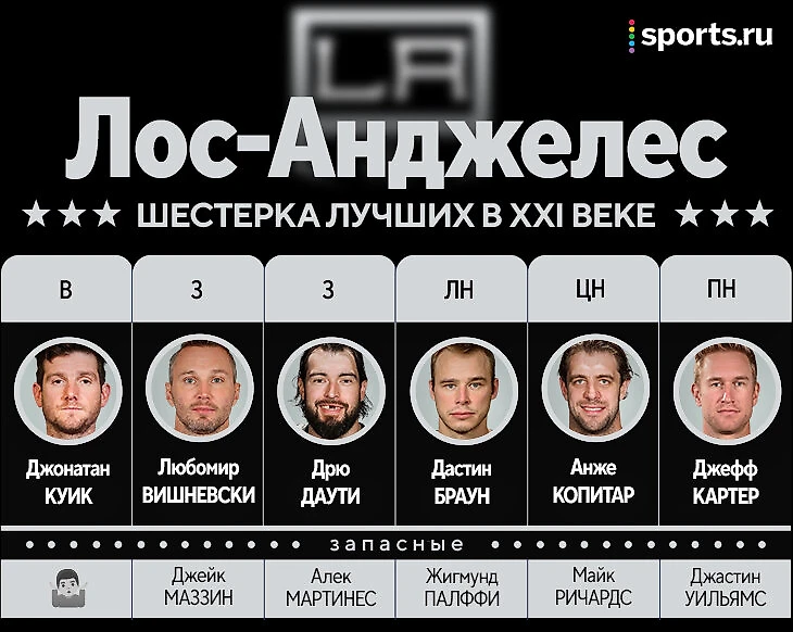 В запасе – спетая парочка Маззин и Мартинеc. Второй, конечно, на чемпионском отрезке был на подхвате, но в целом по дистанции, думаю, заслужил больше, чем Войнов, Скудери или Митчелл. Да, если у вас возник вопрос, где же Роб Блэйк, напомню: в начале 2001-го он ушел за кубком в «Колорадо», а в 2007-м вернулся на пару сезонов, в которых набрал «минус 35». И в итоге даже закончил карьеру не в «Лос-Анджелесе».