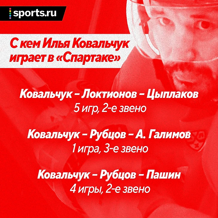 Илья Ковальчук начинал в «Спартаке» во втором звене с Локтионовым и Цыплаковым. С ними он провел 5 матчей, но в игре против СКА (2:5) все изменилось. Там Ковальчука попробовали в третьем сочетании, а Локтионов травмировал руку. В итоге центром у Ковальчука стал Герман Рубцов, а правым крайним – 21-летний Александр Пашин. Для Пашина это первый сезон в КХЛ.