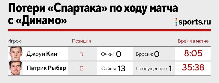 По ходу матча в раздевалку ушли и не вернулись защитник Джоуи Кин («+3» в полезности, когда его уводили) и вратарь Патрик Рыбар, которого под трибунами уже заметили на костылях. Вот эпизод, после которого в игре «Спартака» и «Динамо» – как в декабрьском матче – появился четвертый вратарь (бело-голубые своего еще по ходу первого периода сменили).