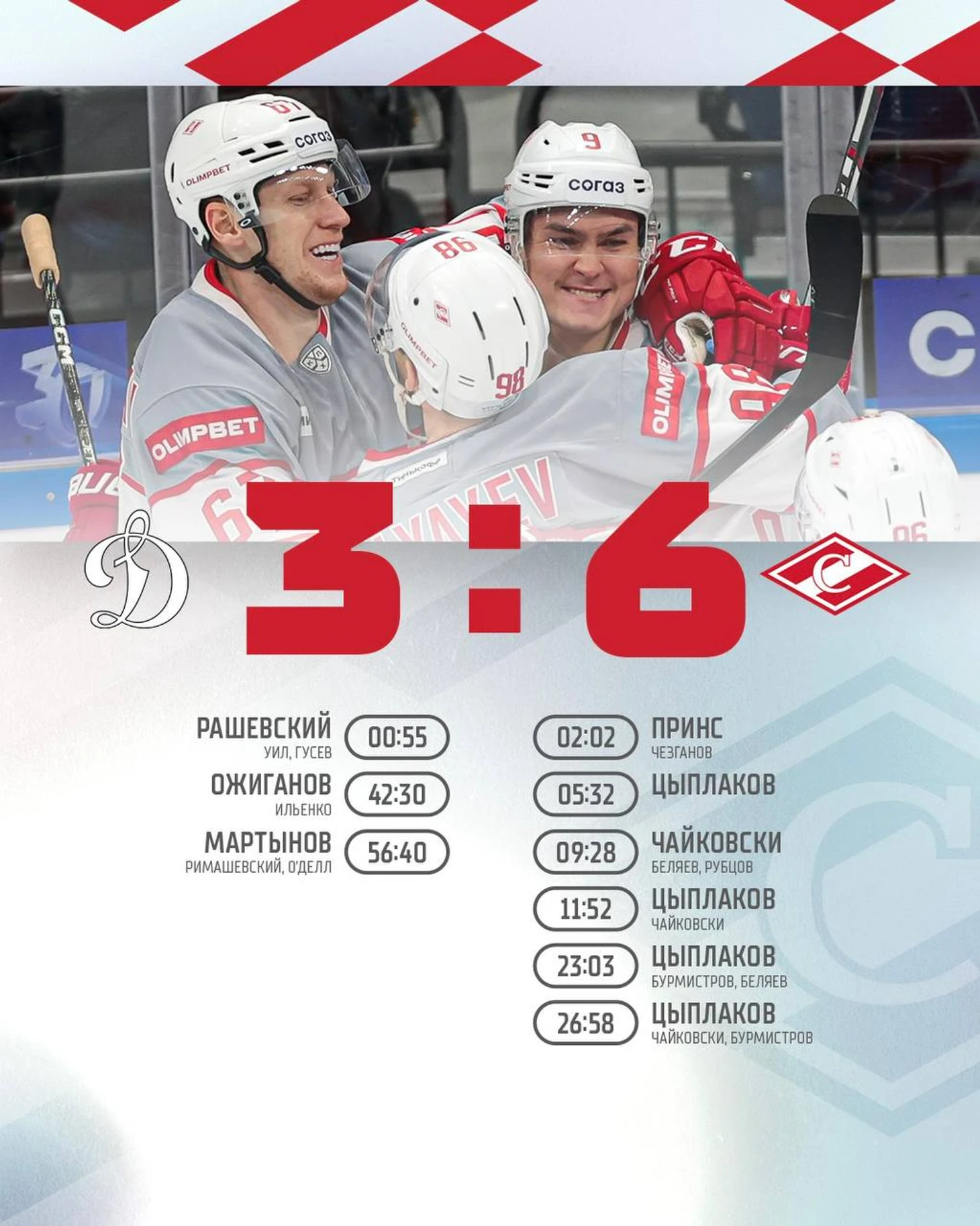Хоккеисты «Спартака» одержали гостевую победу над «Динамо» (6:3) в московском дерби в рамках Фонбет Чемпионата КХЛ.