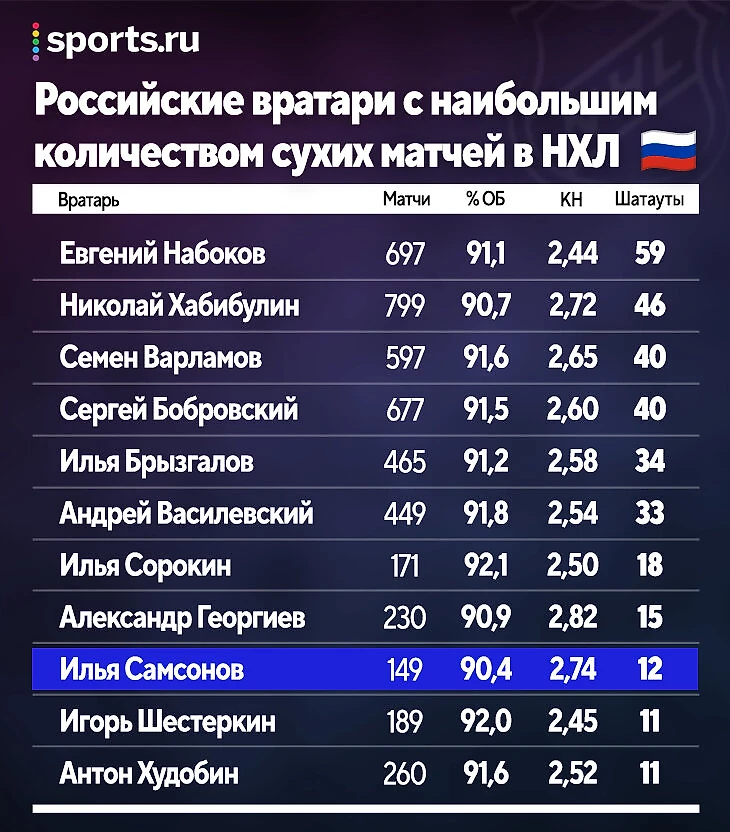 Несмотря на провальный старт сезона, на счету Самсонова сейчас два из четырех сухих матчей «Торонто» в регулярке-2023/24. Всего у Ильи 12 сухарей – теперь он на чистом девятом месте по этому показателю среди российских вратарей.